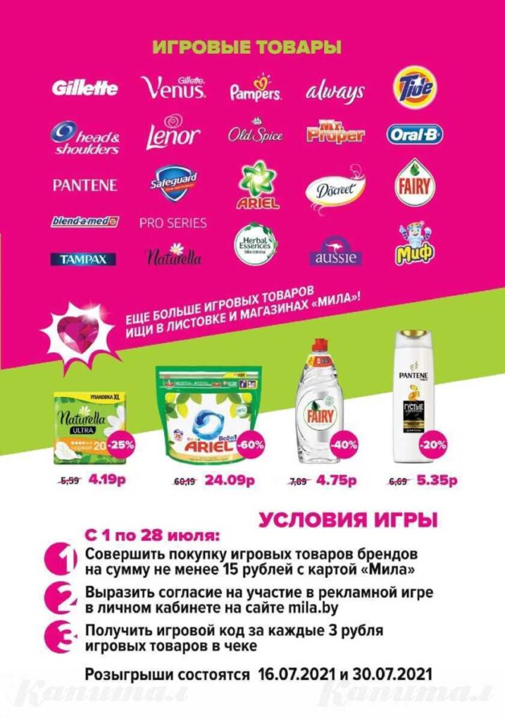 Очередная игра от сети магазинов Мила «Зажги лето в Миле». Чтобы принять участие в рекламной игры необходимо с 1 по 28 июля 2021 года совершить покупку игровых товаров брендов Procter&Gamble на сумму не менее 15 руб. в одном чеке в любом магазине розничной сети «Мила», используя при расчёте зарегистрированную на сайте https://mila.by/ карту лояльности сети «Мила» — и получи шанс выиграть призы. А призы просто замечательные!